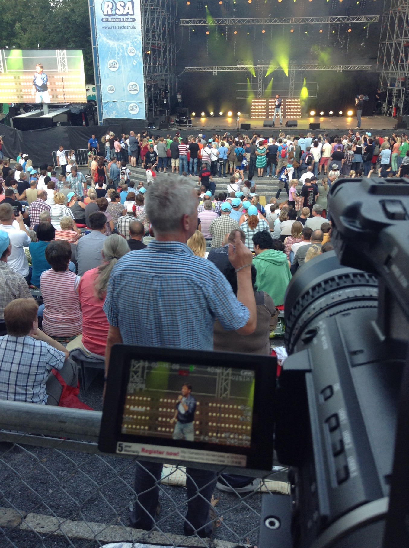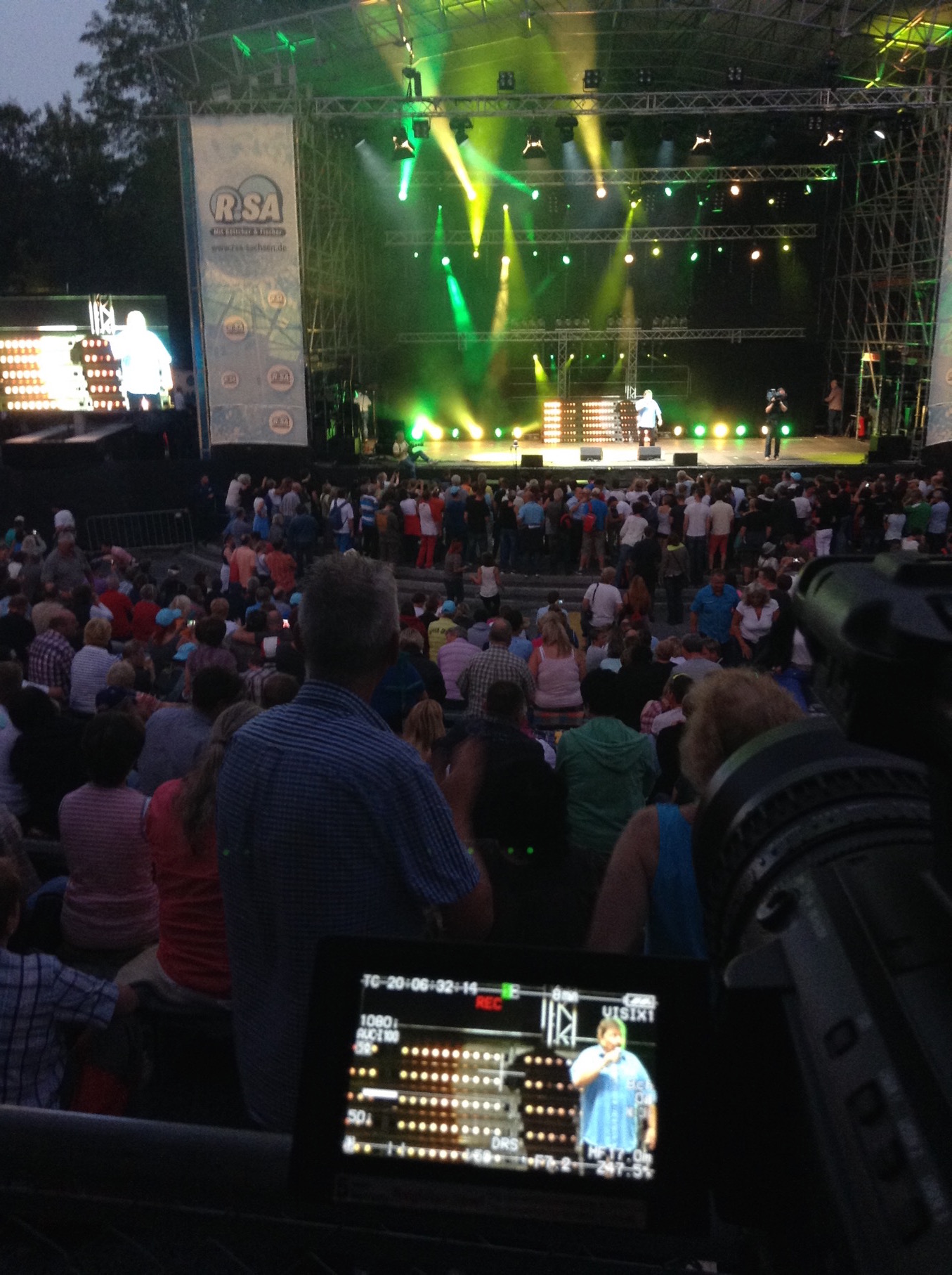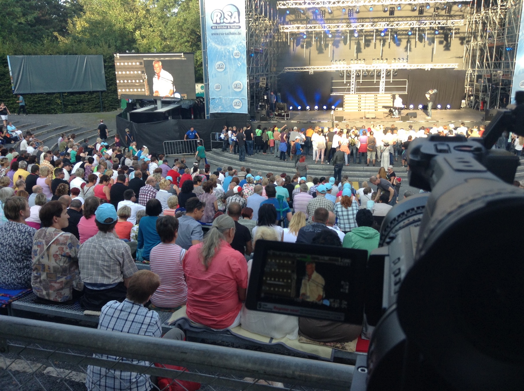Der Radiosender R.SA veranstaltete für das 20-jährige Bestehen seines Moderatorenduos Böttcher & Fischer eine große Show auf der Hutbergbühne in Kamenz. Es traten namhafte Künstler auf wie Karat, Purple Schulz, Harpo, Cora, Costa Cordalis und Achim Menzel. Ich war wieder an der Totalkamera im FOH und habe live die Videowand bespielt.
